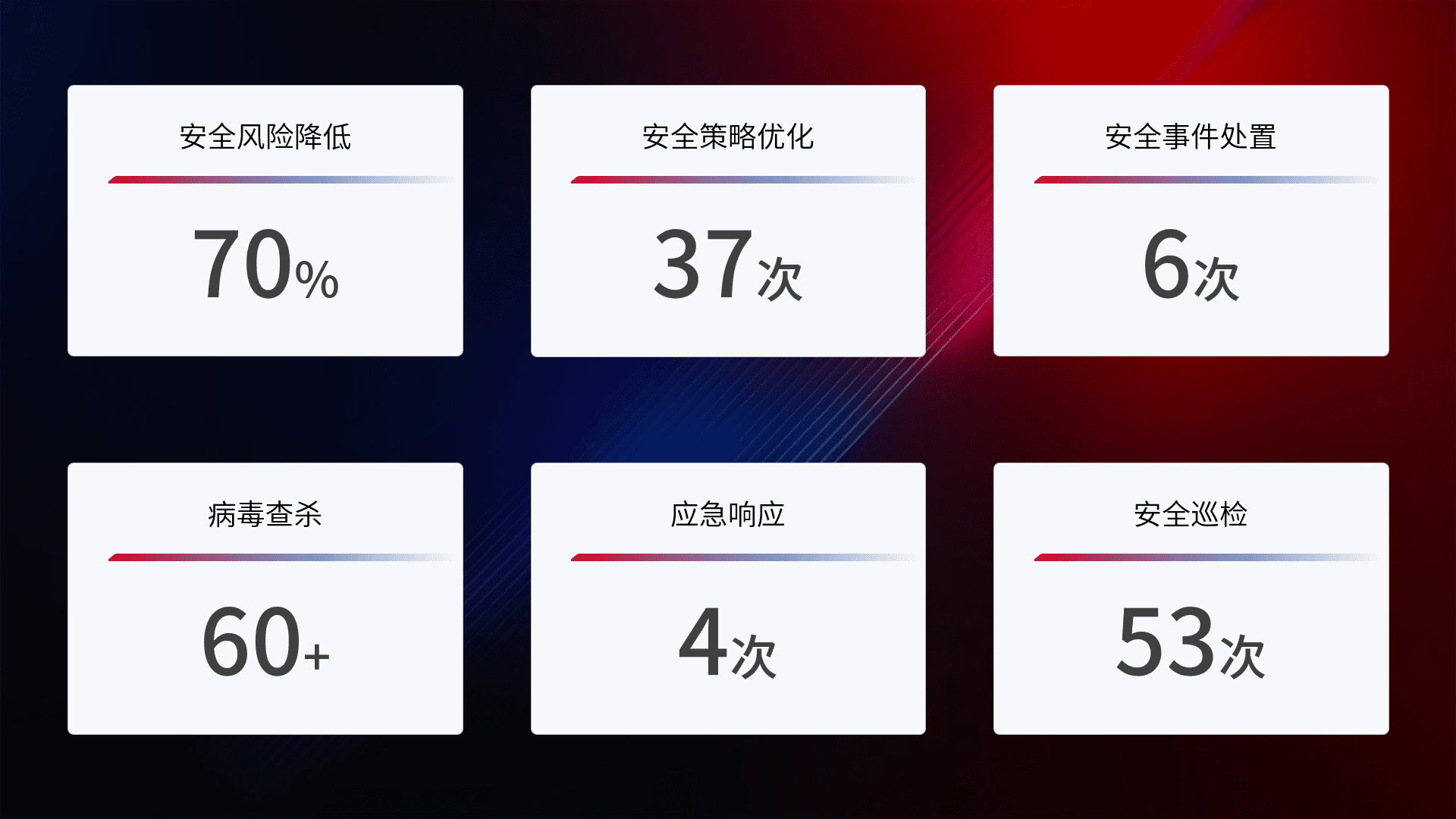 提供全面的安全事件报告体系,,,包括处置报告、、周报、、、季度和年度总结,,,结合持续监控,,,帮助客户深入了解网络安全状况。。。。