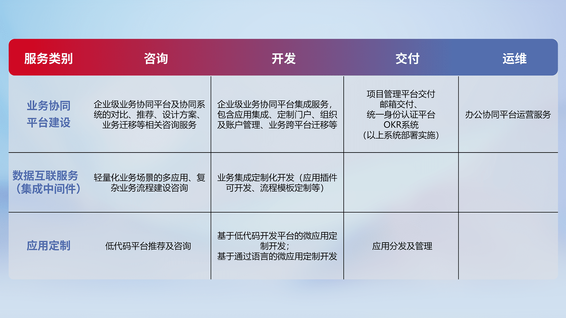 针对钉钉、、、、企微、、IDaas等平台级产品提供产品的规划、、方案、、、交付、、定制化开发等服务,,,实现如统一协同办公、、、智能客户服务、、、混合会议管理、、、、智能数据查询、、、等业务场景,,实现数字化转型。。