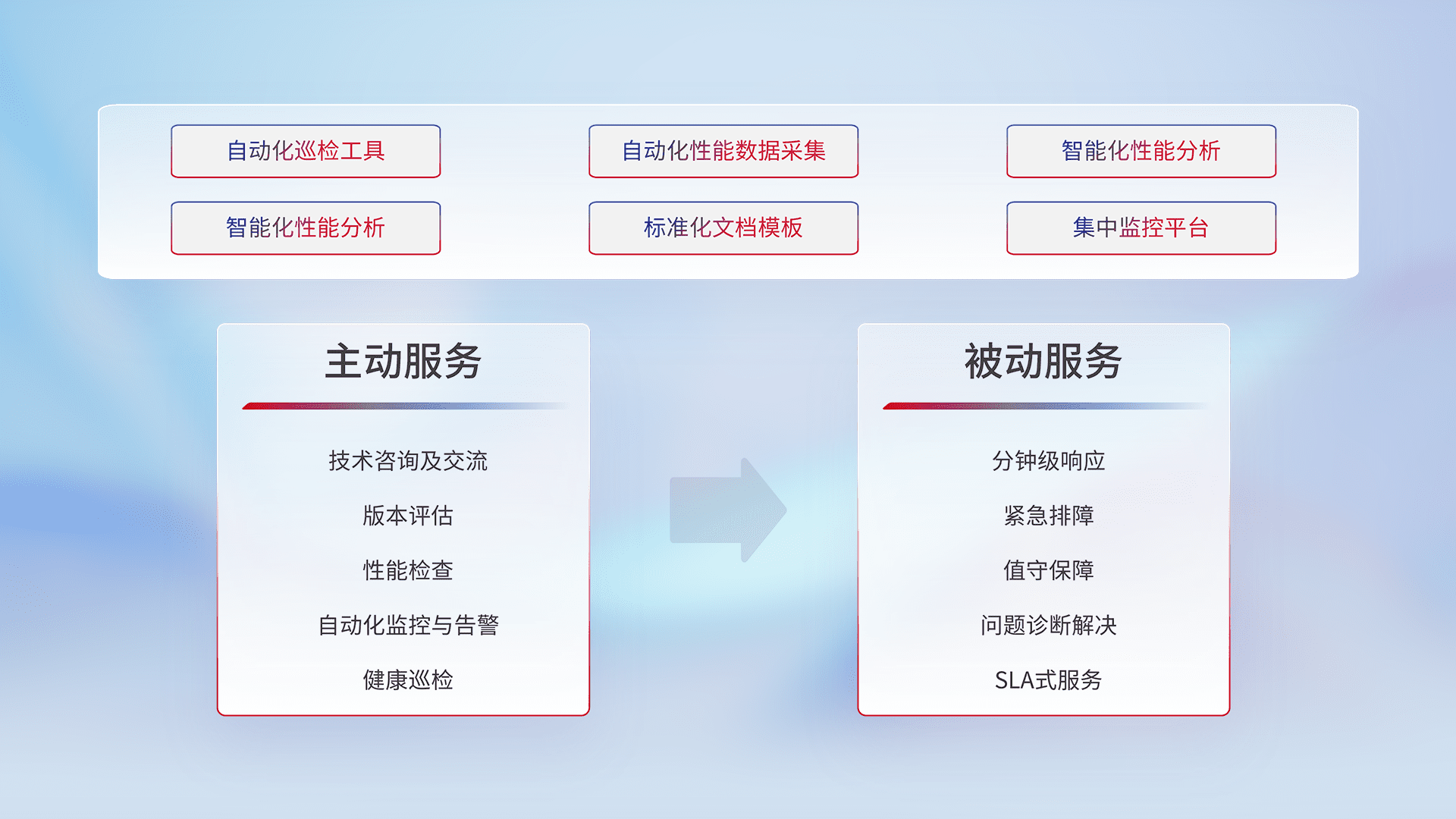 智能化工具和标准化文档,,,保障服务质量,,,提供主动服务(包含技术咨询、、、版本评估、、、、性能检查、、自动化监控与告警、、、、健康巡检)和被动服务包含(分钟级响应、、紧急排障、、值守保障、、、问题诊断解决、、、SLA服务)。。